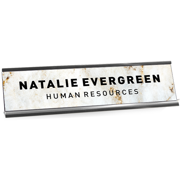 Bring a touch of elegance to your office with this Marble Custom Desk Plate. This desk plate features a stylish marble background and can be fully personalized with your name, title, and logo in full color. It includes a durable aluminum holder, making it the perfect addition to any professional workspace.
